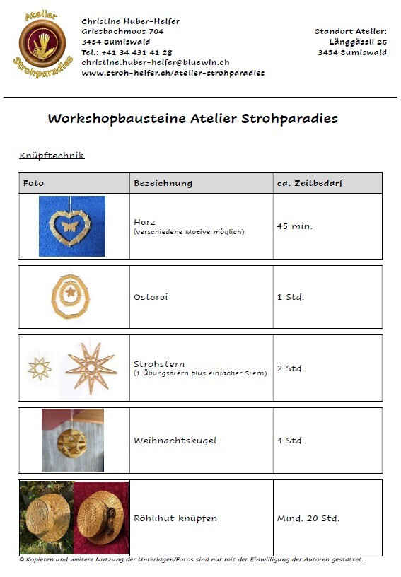Sie möchten schon lange einen Strohstern selbst knüpfen? Oder ein ganz spezielles Agréments herstellen? Oder sogar verschiedene Techniken an einem Tag erlernen?